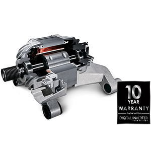 تستخدم تكنولوجيا العاكس الرقمي مغناطيسيات قوية، تزيد من كفاءة الأداء وتزيد هدوء الغسالة الذي يصل إلى 5 ديسيبل أثناء دورة الغسيل و3 ديسيبل عند الدوران، مع توفير الكهرباء المستهلكة. وهي مع ذلك تمنحك متانة فائقة بضمان 10 أعوام
